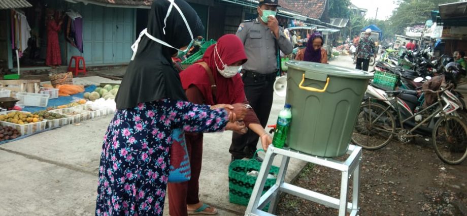 Pembagian Masker  dan Penyediaan Cuci Tangan di Pasar Harjowinangun serta Woro-Woro dipasar yang dilaksanakan Babinkantibmas Polsek Dempet. Jumat (17/4)