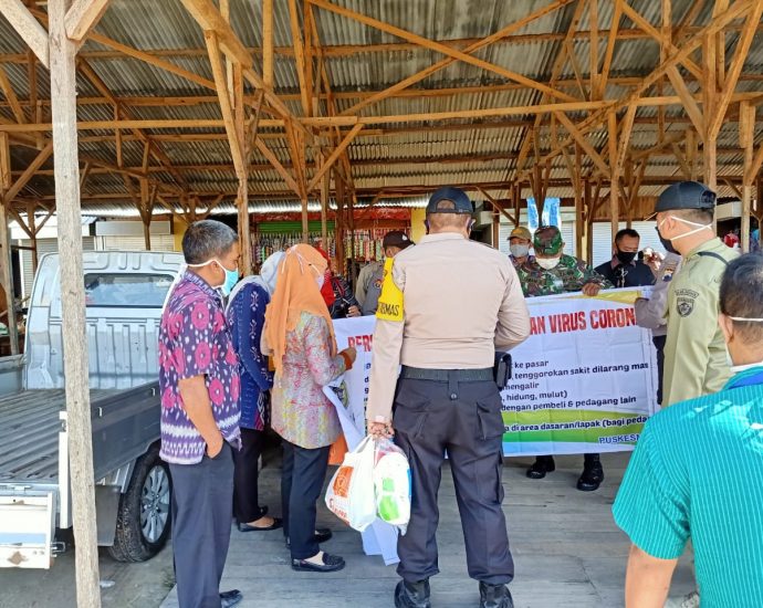 Sosialisasi dan Edukasi pembagian Masker dari Puskesmas Dempet di Pasar Wonolopo Dempet agar Para Pedagang dan Pembeli selalu Wajib Menggunakan Masker guna untuk memutus rantai penyebaran Covid-19 Selasa (23/6)