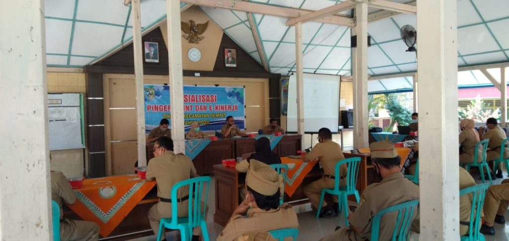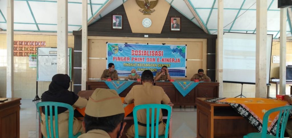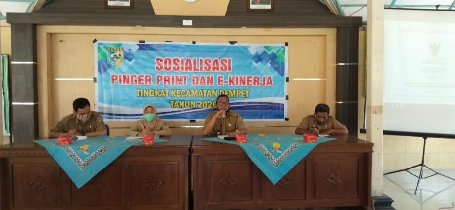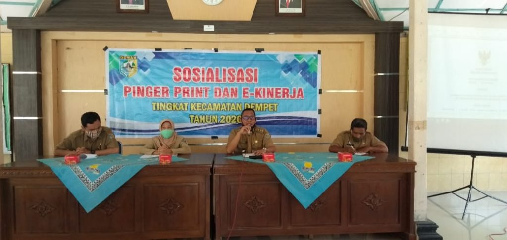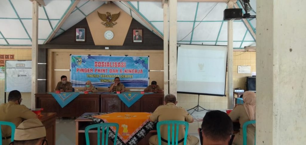 Sosialisasi Pinger Print dan E-kinerja pada ASN dilingkungan Kec. Dempet Kab. Demak di Pendopo Kecamatan Dempet.yang di hadiri dari BKPP Kabid Kepegawaian Ibu Sri Miyarti, SH, MH , Camat Dempet, Karyawan dan Karyawati Kecamatan Dempet serta Sekertaris Desa se Kecamatan Dempet.