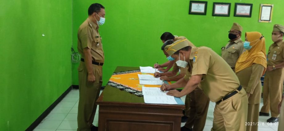 Penandatanganan Pakta Integritas dan Perjanjian Kinerja seluruh PNS Kantor Kecamatan Dempet Tahun 2021, Senin (08/02/2021).